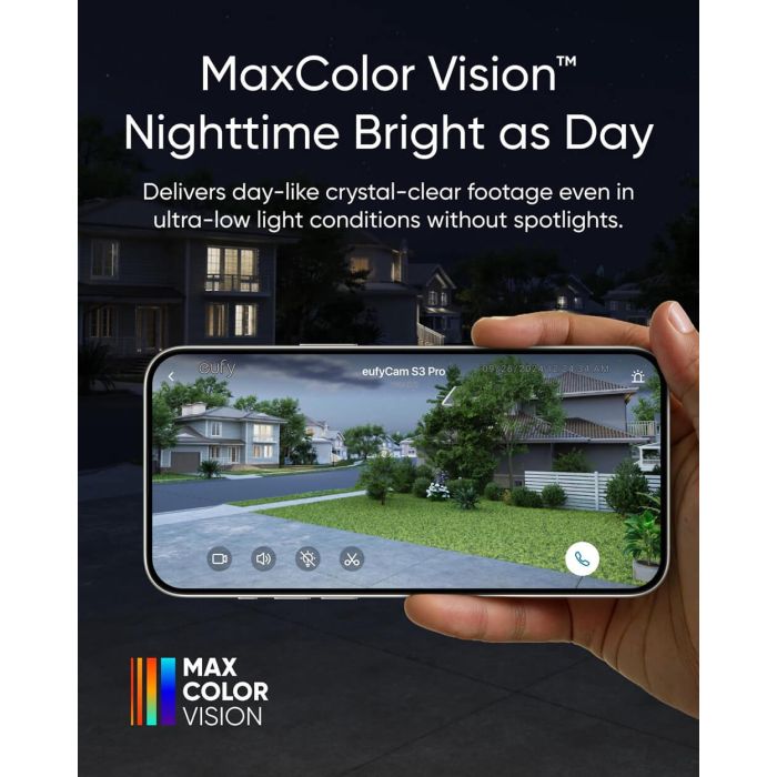 S pomočjo 4K kamere in tehnologije MaxColor Vision™ eufyCam S3 Pro zagotavlja izjemno jasne varnostne posnetke v vsakem trenutku. Omogoča dnevno jasnost slike tudi v zelo nizkih svetlobnih pogojih brez potrebe po reflektorju.
