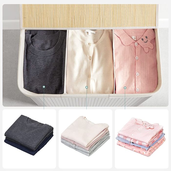 Koš za perilo je velik 60 x 40 x 61,5 cm (d x š x v) in ima veliko prostornino 150 l za vaša oblačila, brisače in posteljnino. S tremi razdelki lahko razvrstite oblačila različnih barv.