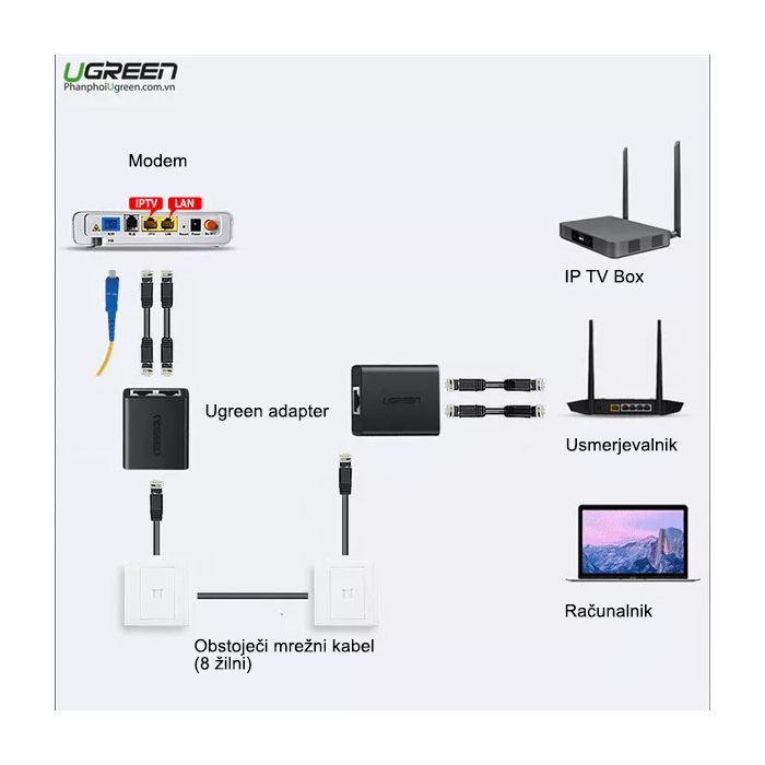 Ta adapter lahko uoprabite, da vam oba signala pošlje po enem kablu in na drugem adapterju spet dobite ločena signala IPTV in Internet.