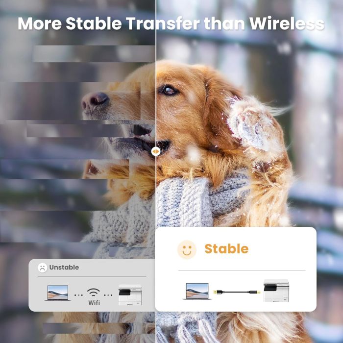 do 480 Mb/s prenaša podatkovno hitrost za naprave USB 2.0, kabel USB tipa B je nazaj združljiv s polno hitrostjo USB 1.1 (12 Mb/s) in nizko hitrostjo USB 1.0 (1,5 Mb/s). V primerjavi s povezavo WIFI ta kabel USB B zagotavlja stabilnejši prenos podatkov in nudi bolj učinkovito delo za vas