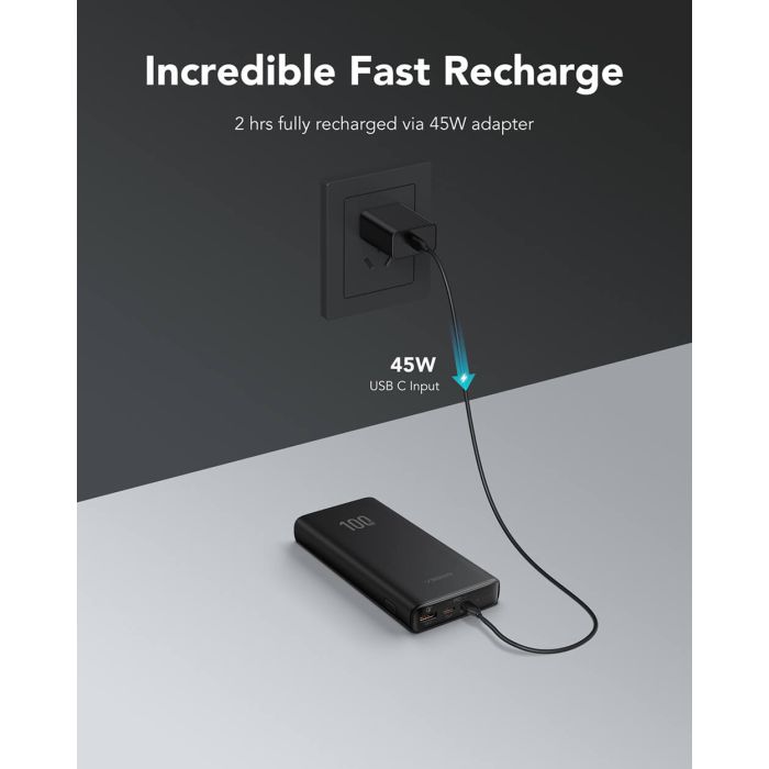 Izjemno hitro 45W PD polnjenje Združite priložen USB-C na USB-C kabel s 45W stenskim polnilcem (ni priložen), da napolnite power bank v 2 urah.