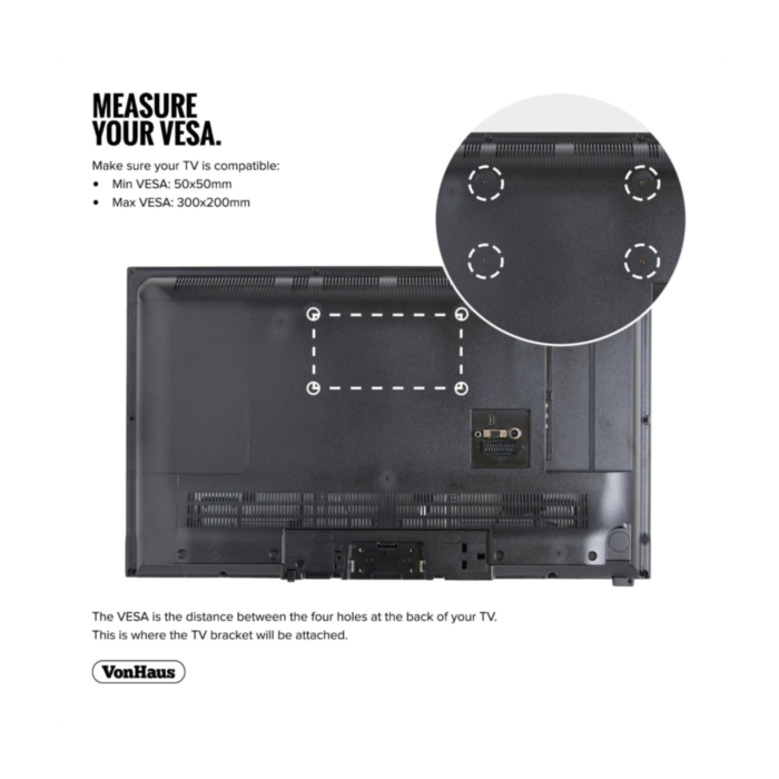 VESA: 50×50, 75×75, 100×100, 200×200, 300x200mm