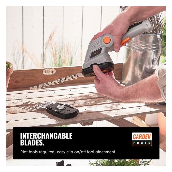 - Zasnova 2 v 1 vam omogoča pretvorbo med ročnimi škarjami za živo mejo in funkcijami pokončnega striženja trave s podaljškom