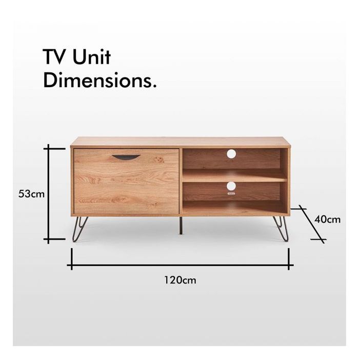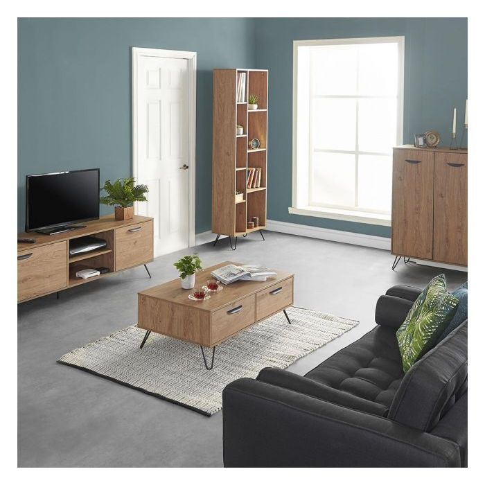 VonHaus Capri manjša TV omarica je lahko tudi samostojna omarica za shranjevanje. Na pogled tradicionalna, v barvi hrasta, jo močne, črne, jeklene noge naredijo elegantno in trendi. Na eni strani vam je na voljo izvlečni predal, na drugi pa dve robustni polici z izrezom na hrbtni strani za kable, da ti ne bodo vidni.