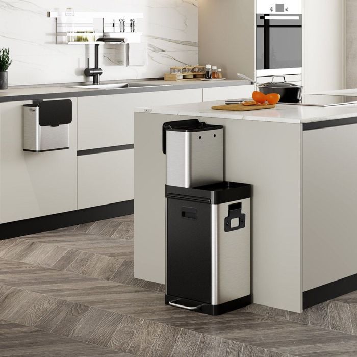 Nihče ne želi kuhati v kuhinji, ki je natrpana s starimi ovoji, ostanki hrane in drobtinami. Tukaj pride prav naš večpredelni koš, ki vsebuje dva zgornja vsestranska koša; z 6L prostornine sta idealna za organske odpadke. Stranska ročaja sta odstranljiva in služita tudi kot sponki za omarice, tako da lahko med pripravo hrane oba 6L koša enostavno odstranite in pritrdite na vrata omarice. Poslovite se od neurejenih pultov in tal, polnih drobtin!