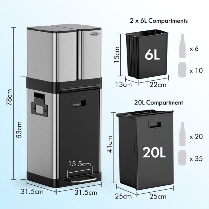 Poenostavite recikliranje s našim trojnim košem s tremi predelki, zasnovanim tako, da vaša kuhinja ostane sveža, hkrati pa prispeva k varovanju okolja. Z dimenzijami 31,5 cm x 31,5 cm x 78 cm ponuja navpična zasnova trojnega koša kompaktno osnovo, a hkrati dovolj prostora za vse vaše kartone, pločevinke, plastiko ali splošne gospodinjske odpadke.