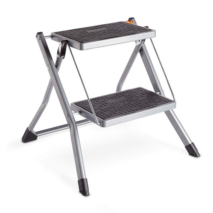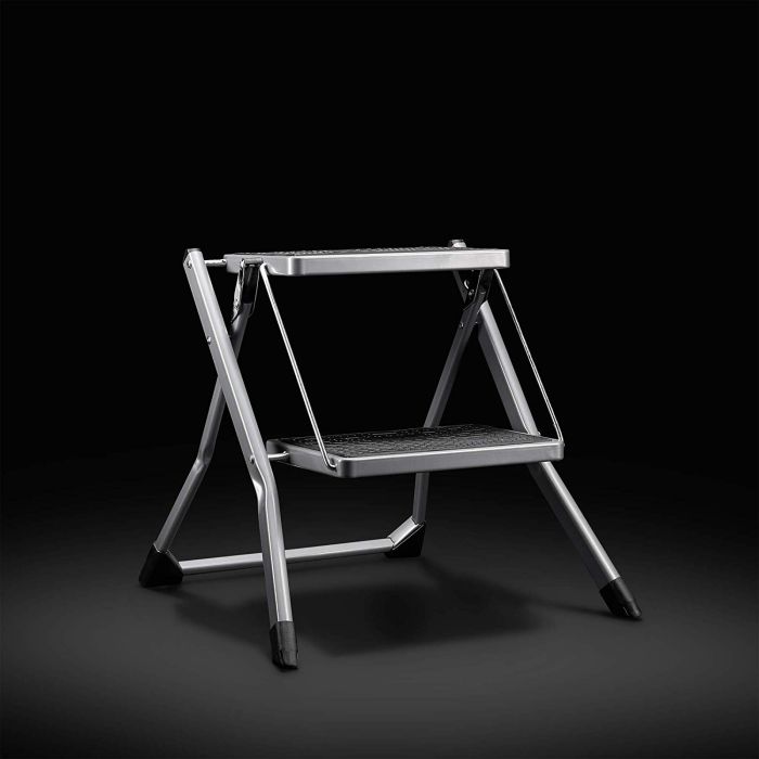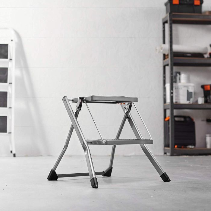 - Prenosna, jeklena lestev z dvema policama, ki se zloži v kompaktno velikost za lažje shranjevanje